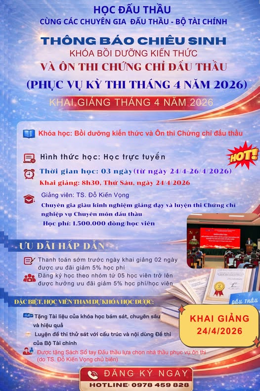 CHIÊU SINH KHAI GIẢNG KHOÁ BỒI DƯỠNG KIẾN THỨC VÀ ÔN THI CHỨNG CHỈ ĐẤU THẦU NGÀY 24-26.4.2026