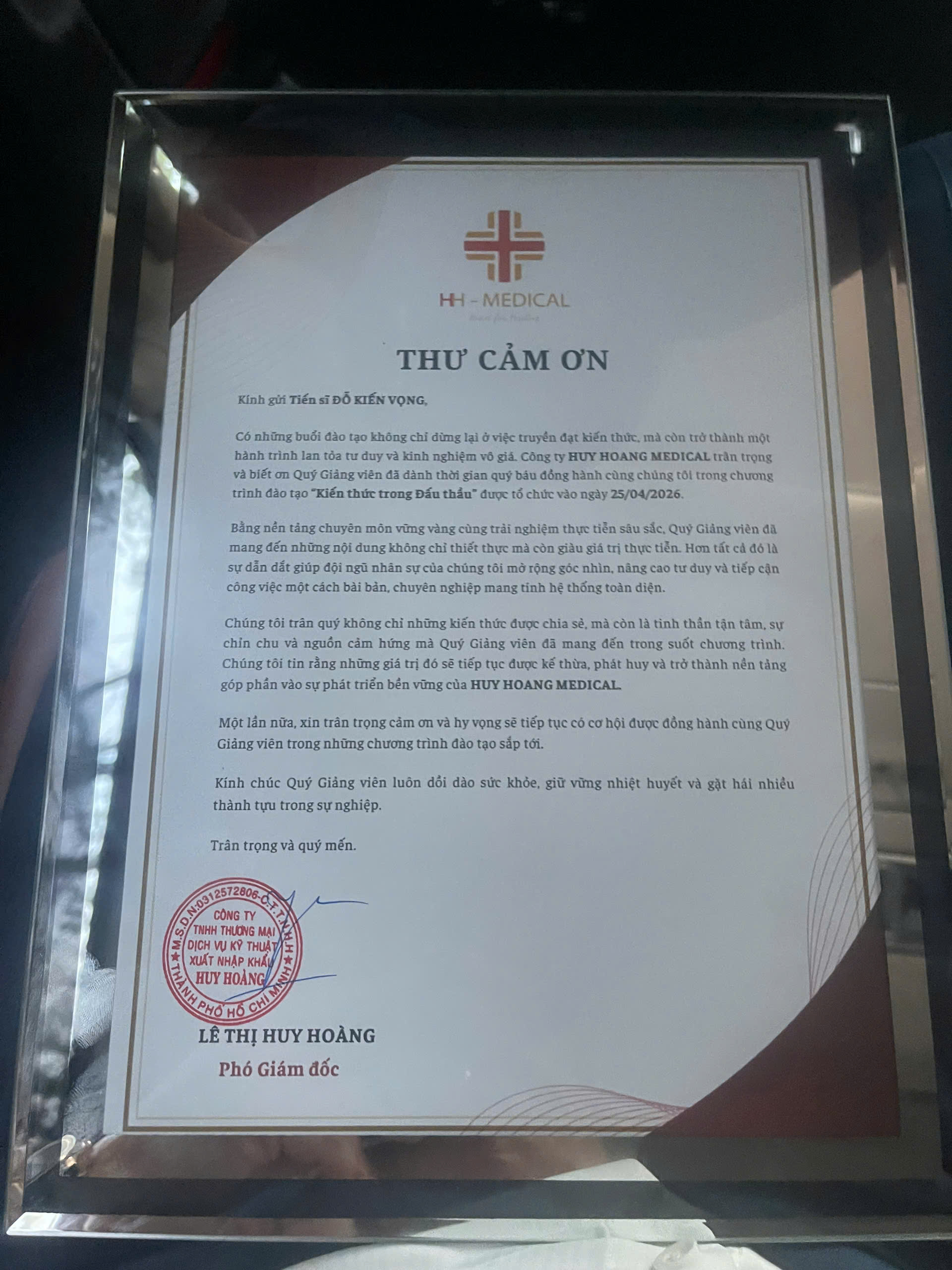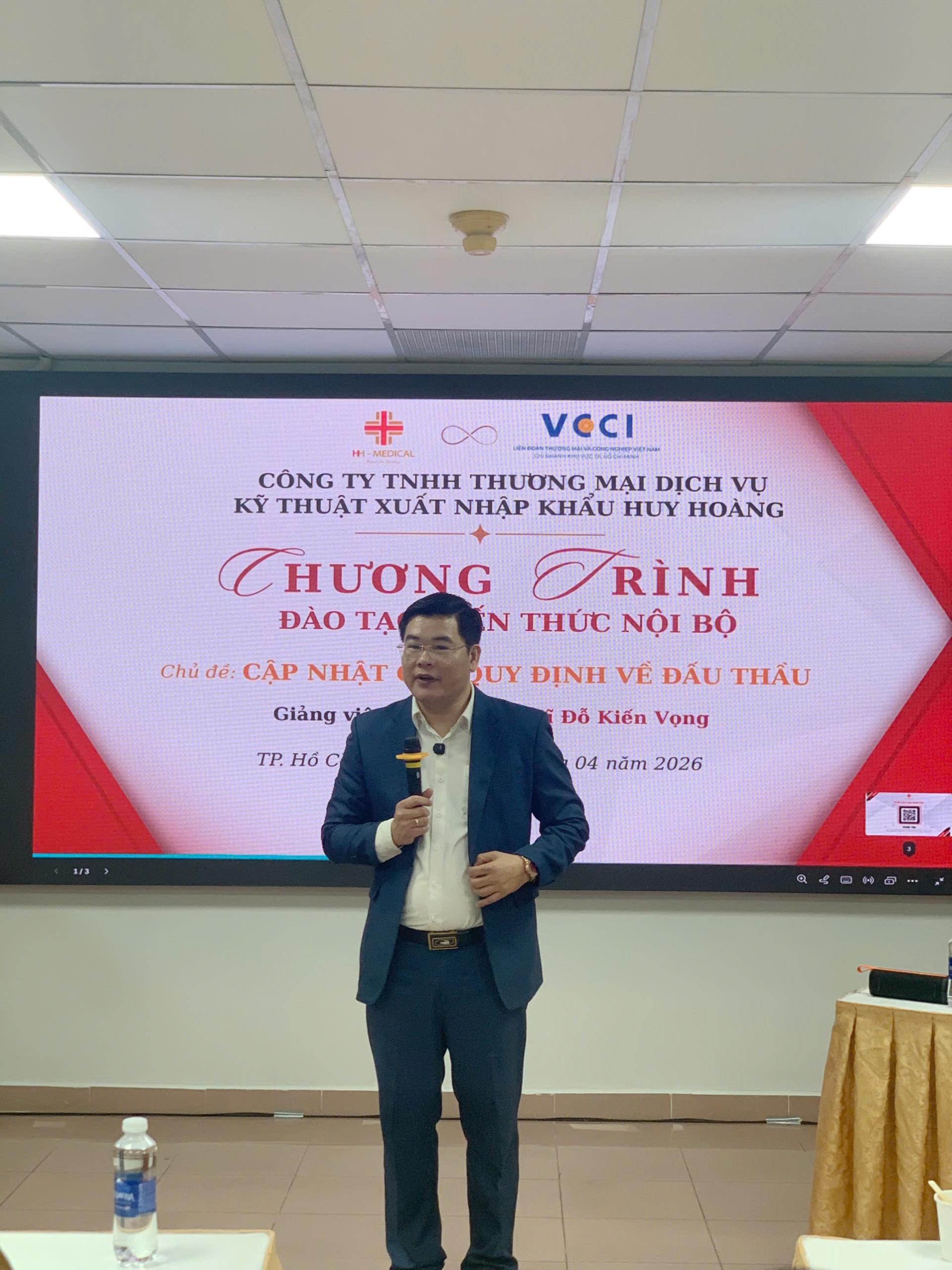 Ngày 25/04/2026, TS. Đỗ Kiến Vọng – chuyên gia, giảng viên đấu thầu giàu kinh nghiệm – đã trực tiếp giảng dạy chương trình “Cập nhật các quy định về đấu thầu trong lĩnh vực thiết bị y tế” dành cho đội ngũ cán bộ của Công ty TNHH Thương mại Dịch vụ Kỹ thuật Xuất Nhập Khẩu Huy Hoàng.
